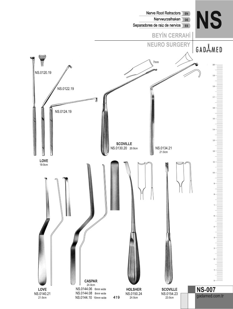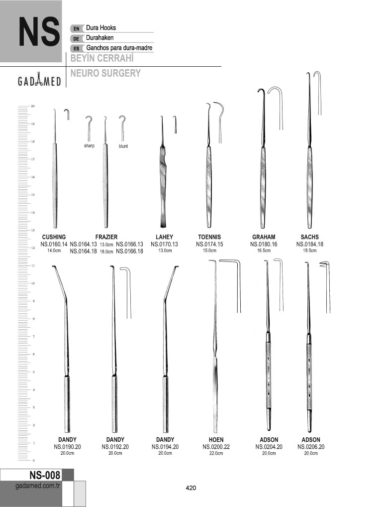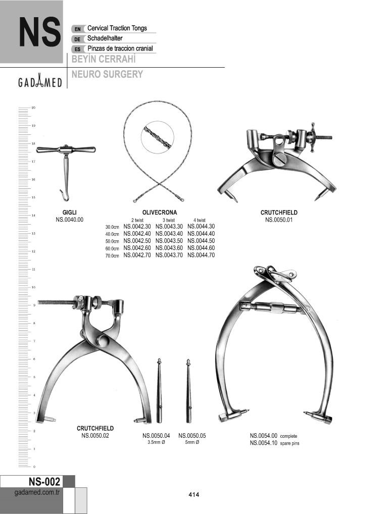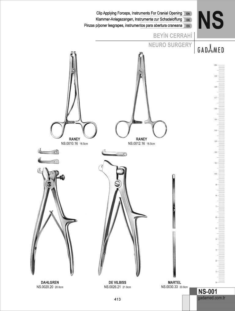 NS.0010.16 8681091050857 RANEY KLİPS UYGULAMA SÖKME FORSEPSİ 16.5CM NS.0012.16 8681091050864 RANEY KLİPS UYGULAMA SÖKME FORSEPSİ 16.5CM NS.0020.20 8681091050871 DAHLGREN KRANİYEL RONGÖR FORSEPSİ 20CM, 2 KANCALI NS.0026.21 8681091050888 DE VİLBİSS KRANİYEL RONGÖR 21CM, BİR ADET BÜYÜK NS.0030.33 8681091050895 DE MARTEL GİGLİ TESTERE KILAVUZU/KONDÜKTÖR 33CM NS.0040.00 8681091050901 GİGLİ TESTERE SAPI (ÇİFT) NS.0042.30 8681091050918 OLIVECRONA GIGLI TESTERE TELİ X2 BURGU 30CM NS.0042.40 8681091050925 OLIVECRONA GIGLI TESTERE TELİ X2 BURGU 40CM NS.0042.50 8681091050932 OLIVECRONA GIGLI TESTERE TELİ X2 BURGU 50CM NS.0042.60 8681091050949 OLIVECRONA GIGLI TESTERE TELİ X2 BURGU 60CM NS.0042.70 8681091050956 OLIVECRONA GIGLI TESTERE TELİ X2 BURGU 70CM NS.0043.30 8681091050963 OLIVECRONA GIGLI TESTERE TELİ X3 BURGU 30CM NS.0043.40 8681091050970 OLIVECRONA GIGLI TESTERE TELİ X3 BURGU 40CM NS.0043.50 8681091050987 OLIVECRONA GIGLI TESTERE TELİ X3 BURGU 50CM NS.0043.60 8681091050994 OLIVECRONA GIGLI TESTERE TELİ X3 BURGU 60CM NS.0043.70 8681091051007 OLIVECRONA GIGLI TESTERE TELİ X3 BURGU 70CM NS.0044.30 8681091051014 OLIVECRONA GIGLI TESTERE TELİ X4 BURGU 30CM NS.0044.40 8681091051021 OLIVECRONA GIGLI TESTERE TELİ X4 BURGU 40CM NS.0044.50 8681091051038 OLIVECRONA GIGLI TESTERE TELİ X4 BURGU 50CM NS.0044.60 8681091051045 OLIVECRONA GIGLI TESTERE TELİ X4 BURGU 60CM NS.0044.70 8681091051052 OLIVECRONA GIGLI TESTERE TELİ X4 BURGU 70CM NS.0050.01 8681091051069 CRUTCHFIELD TRAKSİYON TUTUCU KÜÇÜK NS.0050.02 8681091051076 CRUTCHFIELD TRAKSİYON TUTUCU BÜYÜK NS.0050.04 8681091051083 CRUTCHFIELD MATKAP UCU 3.5MM NS.0050.05 8681091051090 CRUTCHFIELD MATKAP UCU 5.0MM NS.0054.00 8681091051106 SERVİKAL TRAKSİYON TUTUCU BÜYÜK NS.0054.10 8681091051113 YALNIZCA TRAKSİYON TUTUCULARI İÇİN YEDEK PİN NS.0060.14 8681091051120 Olivecrona - Toennis Klips Forsepsi 14cm NS.0070.15 8681091051137 Mckenzie Klips Uygulama Forsepsi 15cm NS.0070.19 8681091051144 Mckenzie Klips Uygulama Forsepsi 19cm NS.0072.15 8681091051151 Mckenzie Klips Uygulama Forsepsi 15cm NS.0072.19 8681091051168 Mckenzie Klips Uygulama Forsepsi 19cm NS.0080.23 8681091051175 Smithwick Klips Uygulama Forsepsi 23cm NS.0080.26 8681091051182 Smithwick Klips Uygulama Forsepsi 26cm NS.0082.23 8681091051199 Sweet Klips Uygulama Forsepsi 23cm NS.0082.25 8681091051205 Sweet Klips Uygulama Forsepsi 26cm NS.0090.10 8681091051212 Cloward Laminia Ayırıcı, vida ile 110mm, 15cm NS.0090.30 8681091051229 Cloward Laminia Ayırıcı, vida ile 30mm, 15cm NS.0090.50 8681091051236 Cloward Laminia Ayırıcı, vida ile 50mm, 15cm NS.0090.70 8681091051243 Cloward Laminia Ayırıcı, vida ile 70mm, 15cm NS.0090.90 8681091051250 Cloward Laminia Ayırıcı, vida ile 90mm, 15cm NS.0092.10 8681091051267 Cloward Laminia Ayırıcı kam/rat. 110mm, 17cm NS.0092.30 8681091051274 Cloward Laminia Ayırıcı kam/rat. 30mm, 17cm NS.0092.50 8681091051281 Cloward Laminia Ayırıcı kam/rat. 50mm, 17cm NS.0092.70 8681091051298 Cloward Laminia Ayırıcı kam/rat. 70mm, 17cm NS.0092.90 8681091051304 Cloward Laminia Ayırıcı kam/rat. 90mm, 17cm NS.0096.16 8681091051311 Cloward Lamina Ayırıcı 16cm NS.0100.16 8681091051328 Inge Lamina Ayırıcı 17cm NS.0102.24 8681091051335 Inge Laminektomi Ayırıcı, 50mm, 24cm NS.0104.27 8681091051342 Inge Lamina Ayırıcı, 12mm uç, 27cm NS.0106.24 8681091051359 Inge Laminektomi Ayırıcı çene 10x20mm, 24cm NS.0108.24 8681091051366 Inge Laminektomi Ayırıcı çene 15x20mm, 24cm NS.0116.28 8681091051373 Inge Laminektomi Ayırıcı çene 22X15mm, 24cm NS.0120.19 8681091051380 LOVE SİNİR KÖKÜ EKARTÖRÜ DÜZ 19CM NS.0122.19 8681091051397 LOVE SİNİR KÖKÜ EKARTÖRÜ DÜZ 19CM 45 Ø AÇILI NS.0124.19 8681091051403 LOVE SİNİR KÖKÜ EKARTÖRÜ DÜZ 19CM 90 Ø AÇILI NS.0130.20 8681091051410 SCOVILLE SİNİR KÖKÜ EKARTÖRÜ AÇILI 7MM, 20CM NS.0134.21 8681091051427 MARTIN SİNİR KÖKÜ EKARTÖRÜ AÇILI 21CM NS.0140.21 8681091051434 KASPAR LOVE SİNİR EKARTÖRÜ 21.00CM NS.0144.06 8681091051441 CASPAR SİNİR KÖKÜ EKARTÖRÜ AÇILI 6MM, 24CM NS.0144.08 8681091051458 CASPAR SİNİR KÖKÜ EKARTÖRÜ AÇILI 8MM, 24CM NS.0144.10 8681091051465 CASPAR SİNİR KÖKÜ EKARTÖRÜ AÇILI 10MM, 24CM NS.0150.24 8681091051472 HOLSHER SİNİR KÖKÜ EKARTÖRÜ KAVİSLİ 7MM, 24CM NS.0154.23 8681091051489 SCOVILLE SİNİR KÖKÜ EKARTÖRÜ DÜZ 8MM, 23CM NS.0160.14 8681091051496 CUSHING DURA KANCALI KESKİN UÇ Í 2MM, 14CM NS.0164.13 8681091051502 FRAZIER KANCALI TEK KESKİN 13CM NS.0164.18 8681091051519 FRAZIER KANCALI TEK KESKİN 18CM NS.0166.13 8681091051526 FRAZIER DURA KANCALI KÜNT 13CM NS.0166.18 8681091051533 FRAZIER DURA KANCALI KÜNT 18CM NS.0170.13 8681091051540 LAHEY DURA KANCA 13CM NS.0174.15 8681091051557 TOENNIS DURA KANCA 15CM NS.0180.16 8681091051564 GRAHAM SİNİR KANCASI KÜNT 16.5CM NS.0184.18 8681091051571 SACHS SİNİR KANCASI 18.5CM NS.0190.20 8681091051588 DANDY SİNİR KANCASI 20CM NS.0192.20 8681091051595 DANDY SİNİR KANCASI 20CM NS.0194.20 8681091051601 DANDY SİNİR KANCASI 20CM NS.0200.22 8681091051618 HOEN DURA KANCALI KÜNT 22CM NS.0204.20 8681091051625 ADSON SİNİR KANCASI KÜNT 20CM NS.0206.20 8681091051632 ADSON SİNİR KANCASI KESKİN 20CM NS.0210.30 8681091051649 SCOVILLE AÇILI KANCA ve DİSSEKTÖR D/E 30CM NS.0212.30 8681091051656 SCOVILLE KAVİSLİ KANCA ve DİSSEKTÖR D/E 30CM NS.0216.29 8681091051663 SMITHWICJ SİNİR KANCASI KÜÇÜK 29CM NS.0220.19 8681091051670 CUSHING SİNİR KANCASI KÜÇÜK 19CM NS.0220.28 8681091051687 CUSHING SİNİR KANCASI KÜÇÜK 28CM NS.0222.19 8681091051694 CUSHING SİNİR KANCASI BÜYÜK 19CM NS.0222.28 8681091051700 CUSHING SİNİR KANCASI BÜYÜK 28CM NS.0226.17 8681091051717 SMITHWICK SİNİR KANCASI 17CM NS.0226.21 8681091051724 SMITHWICK SİNİR KANCASI 21CM NS.0230.24 8681091051731 DAVIS DURA DİSSEKTÖR ÇİFTE 24CM NS.0234.18 8681091051748 OLIVECRONA DURA DİSSEKTÖR D/E 18CM NS.0234.24 8681091051755 OLIVECRONA DURA DİSSE