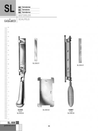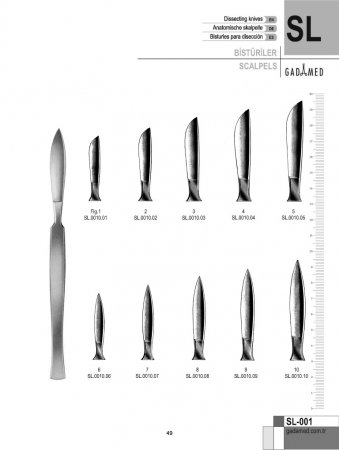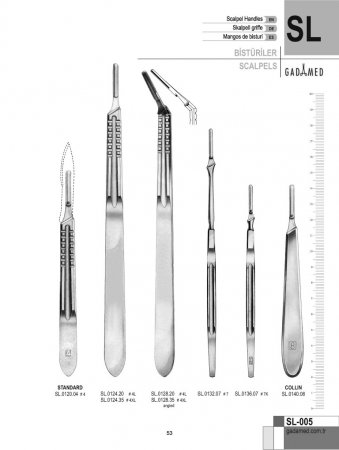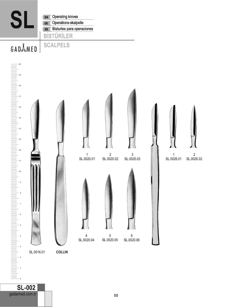 SL.0010.01 8681091005758 Diseksiyon Bıçağı fig.1 SL.0010.02 8681091005765 Diseksiyon Bıçağı fig.2 SL.0010.03 8681091005772 Diseksiyon Bıçağı fig.3 SL.0010.04 8681091005789 Diseksiyon Bıçağı fig.4 SL.0010.05 8681091005796 Diseksiyon Bıçağı fig.5 SL.0010.06 8681091005802 Diseksiyon Bıçağı fig.6 SL.0010.07 8681091005819 Diseksiyon Bıçağı fig.7 SL.0010.08 8681091005826 Diseksiyon Bıçağı fig.8 SL.0010.09 8681091005833 Diseksiyon Bıçağı fig.9 SL.0010.10 8681091005840 Diseksiyon Bıçağı fig.10 SL.0016.01 8681091005857 Diseksiyon Bıçağı SL.0020.01 8681091005864 Operasyon Bıçağı, Collin model fig.1 SL.0020.02 8681091005871 Operasyon Bıçağı, Collin model fig.2 SL.0020.03 8681091005888 Operasyon Bıçağı, Collin model fig.3 SL.0020.04 8681091005895 Operasyon Bıçağı, Collin model fig.4 SL.0020.05 8681091005901 Operasyon Bıçağı, Collin model fig.5 SL.0020.06 8681091005918 Operasyon Bıçağı, Collin model fig.6 SL.0026.01 8681091005925 Mikroskopik diseksiyon Bıçağı, fig.1 SL.0026.02 8681091005932 Mikroskopik diseksiyon Bıçağı, fig.2 SL.0054.08 8681091006007 Kıkırdak Bıçağı, Ahşap Kollu, Vırchow Model, 80 mm - 21.0cm SL.0060.16 8681091006014 Beyin Bıçağı, Vırchow Model, 160 mm - 26.0cm SL.0060.20 8681091006021 Beyin Bıçağı, Vırchow Model, 200 mm - 33.5cm SL.0060.24 8681091006038 Beyin Bıçağı, Vırchow Model, 240 mm - 38.0cm SL.0100.03 8681091006045 Bistüri Sapı, Standart model, No:3 SL.0104.03 8681091006052 Bistüri Sapı, Yivli Tipli, No:3 SL.0108.03 8681091006069 Bistüri Sapı, Ölçülü, No:3 SL.0112.20 8681091006076 Bistüri Sapı, No:3L SL.0112.35 8681091006083 Bistüri Sapı, No:3XL SL.0116.20 8681091006090 Bistüri Sapı, Açılı, No:3L SL.0116.35 8681091006113 Bistüri Sapı, Açılı, No:3XL, 35Cm SL.0120.04 8681091006120 Bistüri Sapı, No:4 SL.0124.20 8681091006137 Bistüri Sapı, No:4L SL.0124.35 8681091006144 Bistüri Sapı, No:4XL, 35 CM SL.0128.20 8681091006151 Bistüri Sapı, Uzun Açılı, No:4L SL.0128.35 8681091006175 Bistüri Sapı, Açılı, No:4XLA 35CM SL.0132.07 8681091006182 Bistüri Sapı, No:7 SL.0136.07 8681091006199 Bistüri Sapı, Özel Model, No: 7K SL.0140.08 8681091006205 Bistüri Sapı, Collın Model, No:8 SL.0148.13 8681091006212 Amputasyon Bıçagı, Collın Model, 13CM SL.0148.16 8681091006229 Amputasyon Bıçagı, Collın Model, 16CM SL.0148.19 8681091006236 Amputasyon Bıçagı, Collın Model, 19CM SL.0148.22 8681091006243 Amputasyon Bıçagı, Collın Model, 22CM SL.0148.28 8681091006250 Amputasyon Bıçagı, Collın Model, 28CM SL.0154.11 8681091006267 Kıkırdak Bıçağı, çift kenar bıçak, Catlın Model, 11 cm SL.0154.16 8681091006274 Kıkırdak Bıçağı, çift kenar bıçak, Catlın Model, 16 cm SL.0154.19 8681091006281 Kıkırdak Bıçağı, çift kenar bıçak, Catlın Model, 19 cm SL.0154.22 8681091006298 Kıkırdak Bıçağı, çift kenar bıçak, Catlın Model, 22 cm SL.0160.17 8681091006304 Amputasyon Bıçağı, Liston Model, 17CM SL.0160.20 8681091006311 Amputasyon Bıçağı, Liston Model, 20CM SL.0164.12 8681091006328 Amputasyon Bıçağı, Langenbeck Model,12CM SL.0170.09 8681091006335 Amputasyon Bıçağı, 9CM SL.0250.01 8681091006342 Katlanır Bıçak SL.0250.02 8681091006359 Katlanır Bıçak, Jilet bölümlü SL.0270.10 8681091006366 Kesici Bıçak, Troutman Chris Model, 9CM SL.0276.10 8681091006373 Tutcu Bıçak Açılı,Troutman Chris Model, 9CM SL.0284.13 8681091006380 Kesici Bıçak, Castroviejo Model, 13CM SL.0290.11 8681091006397 Bıçak Tutucu ve Kesici, 11CM SL.0330.00 8681091006403 Dermatom Bıçağı, Schınk Model, 30CM SL.0330.01 8681091006410 Dermatom Bıçağı, Yedek bıçak, Schınk Model, 30CM SL.0330.02 8681091006427 Dermatom ölçü cetveli, SL.0350.00 8681091006434 Dermatom Bıçağı, Humby Model SL.0350.01 8681091006441 Dermatom Bıçağı, Yedek Bıçak, Humby Model,