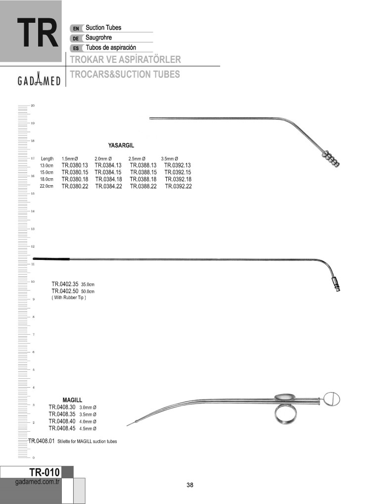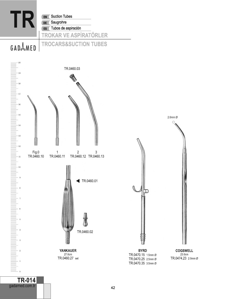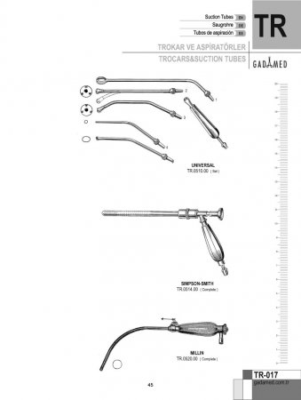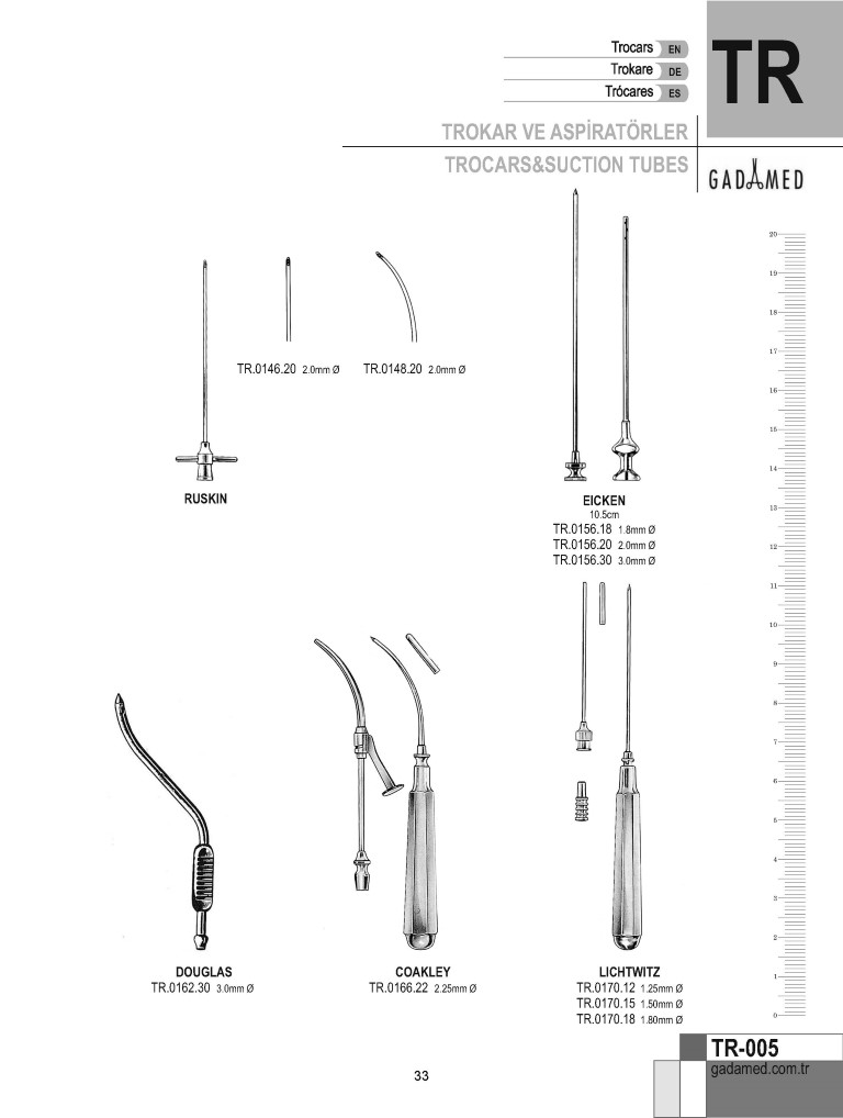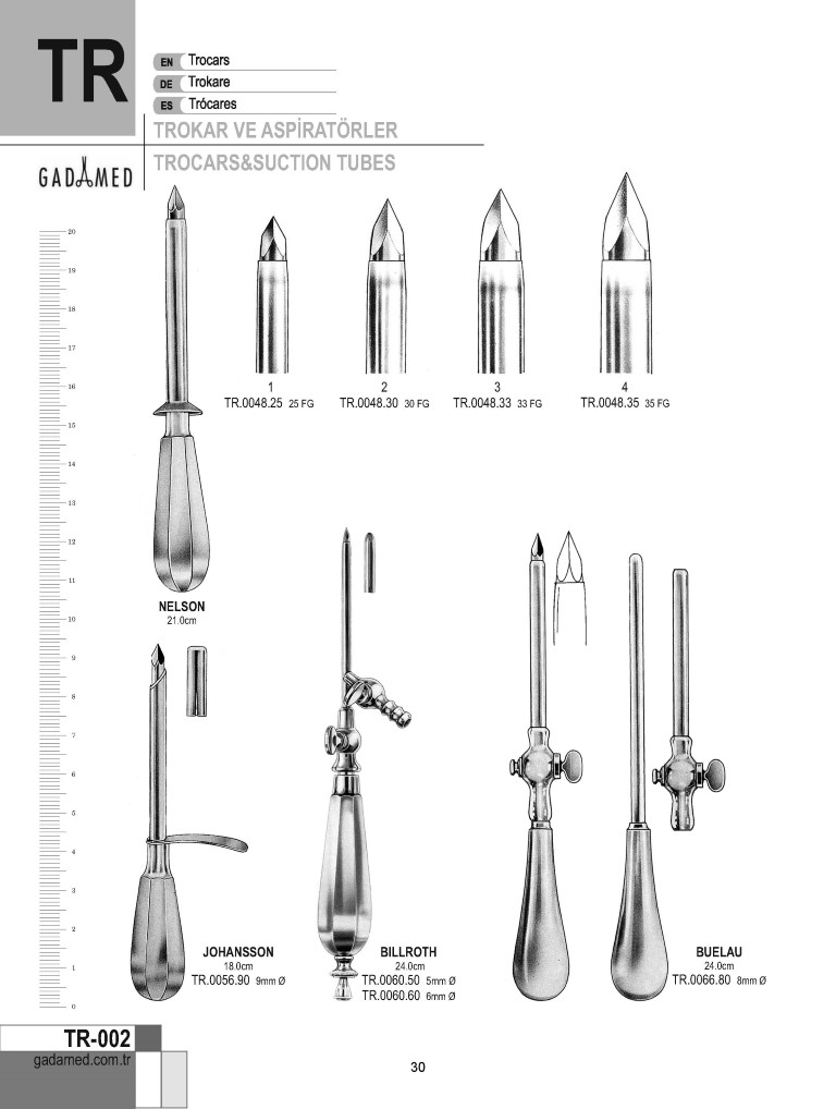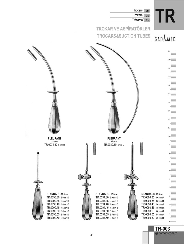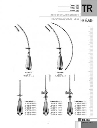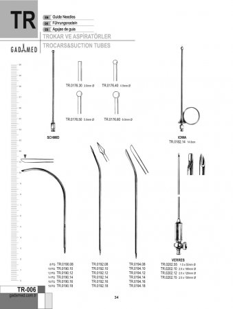 TR.0010.03 8681091003051 Trokar, universal model 3 bıçak, 1 tutamaç set w TR.0010.04 8681091003068 Trokar, universal model 4 bıçak 1 tutamaç set w TR.0016.03 8681091003075 Trokar, universal model 3 bıçak, 1 tutamaç set F TR.0016.04 8681091003082 Trokar, universal model 4 bıçak 1 tutamaç set F TR.0022.08 8681091003099 Trokar, Hydrocele model 8FG 12 cm TR.0022.09 8681091003105 Trokar, Hydrocele model 9FG 12 cm TR.0022.10 8681091003112 Trokar, Hydrocele model 10FG 12 cm TR.0028.16 8681091003129 Trokar, Ascites model 16FG 15 cm TR.0028.21 8681091003136 Trokar, Ascites model 21FG 15 cm TR.0034.08 8681091003143 Trokar, Exploring model 8FG TR.0040.30 8681091003150 Trokar, Krause model 3,0 mm TR.0040.40 8681091003167 Trokar, Krause model 4,0 mm TR.0040.50 8681091003174 Trokar, Krause model 5,0 mm TR.0040.55 8681091003181 Trokar, Krause model 5,5 mm TR.0048.25 8681091003198 Trokar, Nelson model 25 FG 21 cm fig.1 TR.0048.30 8681091003204 Trokar, Nelson model 30 FG 21 cm fig.2 TR.0048.33 8681091003211 Trokar, Nelson model 33 FG 21 cm fig.3 TR.0048.35 8681091003228 Trokar, Nelson model 35 FG 21 cm fig.4 TR.0056.90 8681091003235 Trocar, Johansson model 9mm 18 cm TR.0060.50 8681091003242 Trocar, Billroth model 5 mm 24 cm TR.0060.60 8681091003259 Trocar, Billroth model 6 mm 24 cm TR.0066.80 8681091003266 Trocar, Buelau model 8mm 24 cm TR.0074.50 8681091003273 Trocar, Fleurant model 5 mm TR.0080.50 8681091003280 Trocar, Fleurant model 5 mm 23 cm TR.0090.30 8681091003297 Trokar standart 3 mm 11 cm TR.0090.35 8681091003303 Trokar standart 3.5 mm 11 cm TR.0090.40 8681091003310 Trokar standart 4 mm 11 cm TR.0090.45 8681091003327 Trokar standart 4.5 mm 11 cm TR.0090.50 8681091003334 Trokar standart 5 mm 11 cm TR.0090.55 8681091003341 Trokar standart 5.5 mm 11 cm TR.0090.60 8681091003358 Trokar standart 6 mm 11 cm TR.0094.30 8681091003365 Trokar standart musluklu 3 mm 11 cm TR.0094.35 8681091003372 Trokar standart musluklu 3.5 mm 11 cm TR.0094.40 8681091003389 Trokar standart musluklu 4 mm 11 cm TR.0094.45 8681091003396 Trokar standart musluklu 4.5 mm 11 cm TR.0094.50 8681091003402 Trokar standart musluklu 5 mm 11 cm TR.0094.55 8681091003419 Trokar standart musluklu 5.5 mm 11 cm TR.0094.60 8681091003426 Trokar standart musluklu 6 mm 11 cm TR.0098.30 8681091003433 Trokar standart w/musluklu 3 mm 11 cm TR.0098.35 8681091003440 Trokar standart w/musluklu 3.5 mm 11 cm TR.0098.40 8681091003457 Trokar standart w/musluklu 4 mm 11 cm TR.0098.45 8681091003464 Trokar standart w/musluklu 4.5 mm 11 cm TR.0098.50 8681091003471 Trokar standart w/musluklu 5 mm 11 cm TR.0098.55 8681091003488 Trokar standart w/musluklu 5.5 mm 11 cm TR.0098.60 8681091003495 Trokar standart w/musluklu 6 mm 11 cm TR.0104.55 8681090987291 Duke Trokar ve Kanül Ø 5.5mm, 11 cm TR.0108.45 8681091003518 Trokar, Birch model 4.5 18 cm TR.0110.10 8681091003525 Trokar, kanül, Ochsner model 10 FG TR.0110.12 8681091003532 Trokar, kanül, Ochsner model 12 FG TR.0110.14 8681091003549 Trokar, kanül, Ochsner model 14 FG TR.0110.16 8681091003556 Trokar, kanül, Ochsner model 16 FG TR.0110.18 8681091003563 Trokar, kanül, Ochsner model 18 FG TR.0110.20 8681091003570 Trokar, kanül, Ochsner model 20 FG TR.0110.22 8681091003587 Trokar, kanül, Ochsner model 22 FG TR.0112.10 8681091003594 Trokar, kanül, toraks Ochsner model 10 FG TR.0112.12 8681091003600 Trokar, kanül, toraks Ochsner model 12 FG TR.0112.14 8681091003617 Trokar, kanül, toraks Ochsner model 14 FG TR.0112.16 8681091003624 Trokar, kanül, toraks Ochsner model 16 FG TR.0112.18 8681091003631 Trokar, kanül, toraks Ochsner model 18 FG TR.0112.20 8681091003648 Trokar, kanül, toraks Ochsner model 20 FG TR.0112.22 8681091003655 Trokar, kanül, toraks Ochsner model 22 FG TR.0128.30 8681091003662 Trokar, antrum pierce model 3.0 mm TR.0128.40 8681091003679 Trokar, antrum pierce model 4.0 mm TR.0128.50 8681091003686 Trokar, antrum pierce model 5.0 mm TR.0134.20 8681091003693 Trokar, Landau model 2.0 mm TR.0140.13 8681091003709 Trokar, Pean model 13.5 cm TR.0146.20 8681091003716 Trokar,düz antrum ruskin model 2.0 mm TR.0148.20 8681091003723 Trokar,eğri antrum ruskin model 2.0 mm TR.0156.18 8681091003730 Trokar, antrum eicken model 1.8 mm 10.5 cm TR.0156.20 8681091003747 Trokar, antrum eicken model 2.0 mm 10.5 cm TR.0156.30 8681091003754 Trokar, antrum eicken model 3.0 mm 10.5 cm TR.0162.30 8681091003761 Trokar, Douglas model 3.0 mm TR.0166.22 8681091003778 Trokar, Coakley model 2.25 mm TR.0170.12 8681091003785 Trokar, Lichtwitz model 1.25 mm TR.0170.15 8681091003792 Trokar, Lichtwitz model 1.50 mm TR.0170.18 8681091003808 Trokar, Lichtwitz model 1.80 mm TR.0176.30 8681091003815 İrrigasyon kanülü, 3mm 15 cm TR.0176.40 8681091003822 İrrigasyon kanülü, 4mm 15 cm TR.0176.50 8681091003839 İrrigasyon kanülü, 5mm 15 cm TR.0176.60 8681091003846 İrrigasyon kanülü, 6mm 15 cm TR.0182.14 8681091003853 Anestezi iğnesi, İowa model 14 cm TR.0190.08 8681091003860 Klavuz iğne, 8Fr 15 cm TR.0190.10 8681091003877 Klavuz iğne, 10Fr 15 cm TR.0190.12 8681091003884 Klavuz iğne, 12Fr 15 cm TR.0190.14 8681091003891 Klavuz iğne, 14Fr 15 cm TR.0190.16 8681091003907 Klavuz iğne, 16Fr 15 cm TR.0190.18 8681091003914 Klavuz iğne, 18Fr 15 cm TR.0192.08 8681091003921 Klavuz iğne, Lancet tip 8Fr 15 cm TR.0192.10 8681091003938 Klavuz iğne, Lancet tip 10Fr 15 cm TR.0192.12 8681091003945 Klavuz iğne, Lancet tip 12Fr 15 cm TR.0192.14 8681091003952 Klavuz iğne, Lancet tip 14Fr 15 cm TR.0192.16 8681091003969 Klavuz iğne, Lancet tip 16Fr 15 cm TR.0192.18 8681091003976 Klavuz iğne, Lancet tip 18Fr 15 cm TR.0194.08 8681091003983 Klavuz iğne, Cclosure tip 8Fr 15 cm TR.0194.10 8681091003990 Klavuz iğne, Cclosure 10Fr 15 cm TR.0194.12 8681091004003 Klavuz iğne, Cclosure 12Fr 15 cm TR.0194.14 8681091004010 Klavuz iğne, Cclosure 14Fr 15 cm TR.0194.16 8681091004027 Klavuz iğne, Cclosure 16Fr 15 cm TR.0194.18 8681091004034 Klavuz iğne, LCclosure 18Fr 15 cm TR.0202.10 8681091004041 Veres iğnesi, 2x100 mm TR.02
