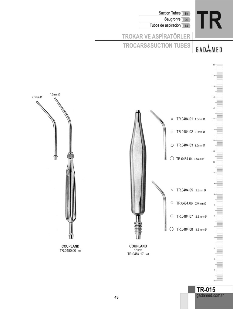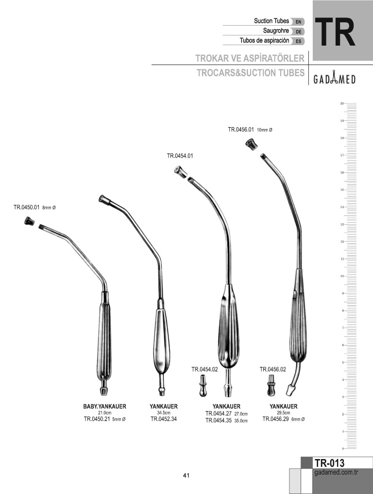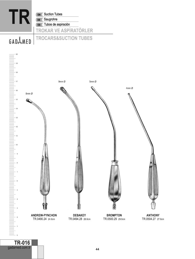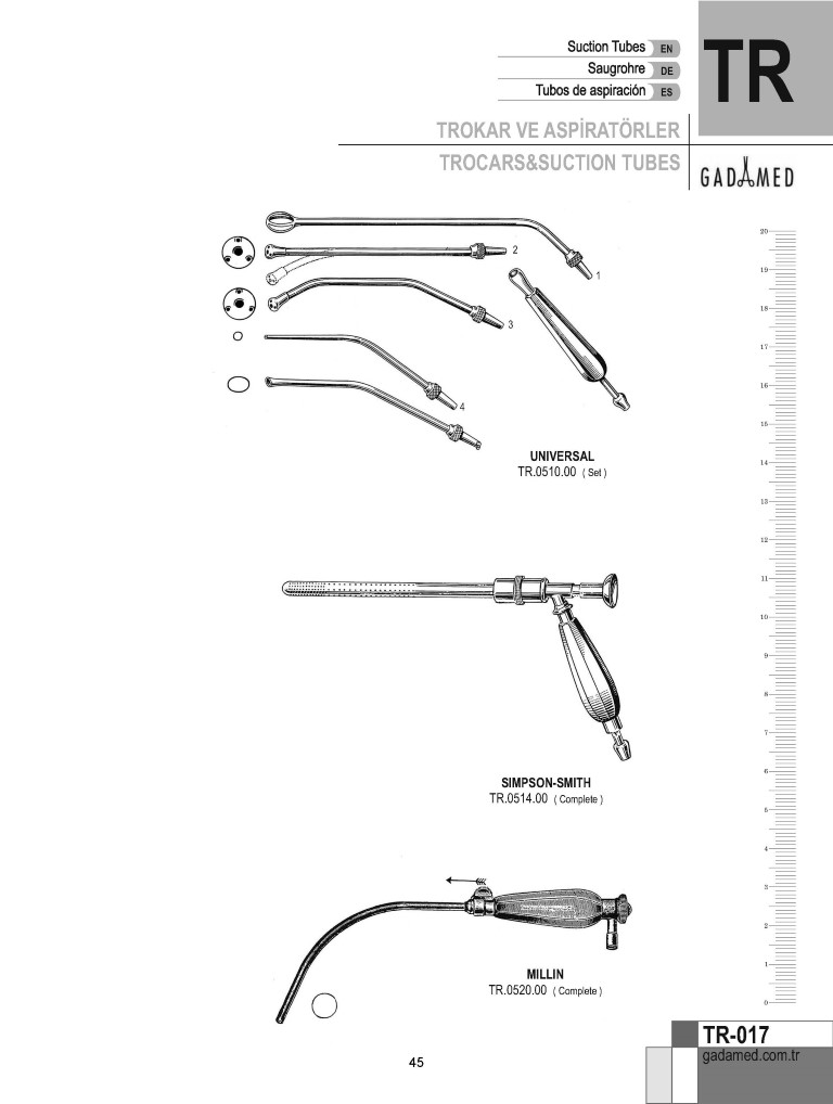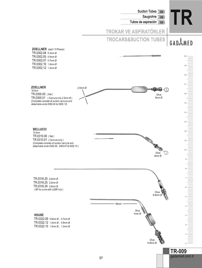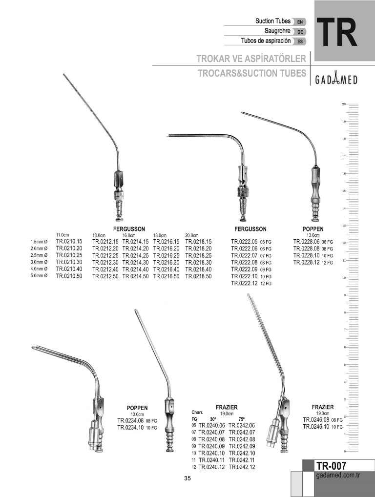 TR.0010.03 8681091003051 Trokar, universal model 3 bıçak, 1 tutamaç set w TR.0010.04 8681091003068 Trokar, universal model 4 bıçak 1 tutamaç set w TR.0016.03 8681091003075 Trokar, universal model 3 bıçak, 1 tutamaç set F TR.0016.04 8681091003082 Trokar, universal model 4 bıçak 1 tutamaç set F TR.0022.08 8681091003099 Trokar, Hydrocele model 8FG 12 cm TR.0022.09 8681091003105 Trokar, Hydrocele model 9FG 12 cm TR.0022.10 8681091003112 Trokar, Hydrocele model 10FG 12 cm TR.0028.16 8681091003129 Trokar, Ascites model 16FG 15 cm TR.0028.21 8681091003136 Trokar, Ascites model 21FG 15 cm TR.0034.08 8681091003143 Trokar, Exploring model 8FG TR.0040.30 8681091003150 Trokar, Krause model 3,0 mm TR.0040.40 8681091003167 Trokar, Krause model 4,0 mm TR.0040.50 8681091003174 Trokar, Krause model 5,0 mm TR.0040.55 8681091003181 Trokar, Krause model 5,5 mm TR.0048.25 8681091003198 Trokar, Nelson model 25 FG 21 cm fig.1 TR.0048.30 8681091003204 Trokar, Nelson model 30 FG 21 cm fig.2 TR.0048.33 8681091003211 Trokar, Nelson model 33 FG 21 cm fig.3 TR.0048.35 8681091003228 Trokar, Nelson model 35 FG 21 cm fig.4 TR.0056.90 8681091003235 Trocar, Johansson model 9mm 18 cm TR.0060.50 8681091003242 Trocar, Billroth model 5 mm 24 cm TR.0060.60 8681091003259 Trocar, Billroth model 6 mm 24 cm TR.0066.80 8681091003266 Trocar, Buelau model 8mm 24 cm TR.0074.50 8681091003273 Trocar, Fleurant model 5 mm TR.0080.50 8681091003280 Trocar, Fleurant model 5 mm 23 cm TR.0090.30 8681091003297 Trokar standart 3 mm 11 cm TR.0090.35 8681091003303 Trokar standart 3.5 mm 11 cm TR.0090.40 8681091003310 Trokar standart 4 mm 11 cm TR.0090.45 8681091003327 Trokar standart 4.5 mm 11 cm TR.0090.50 8681091003334 Trokar standart 5 mm 11 cm TR.0090.55 8681091003341 Trokar standart 5.5 mm 11 cm TR.0090.60 8681091003358 Trokar standart 6 mm 11 cm TR.0094.30 8681091003365 Trokar standart musluklu 3 mm 11 cm TR.0094.35 8681091003372 Trokar standart musluklu 3.5 mm 11 cm TR.0094.40 8681091003389 Trokar standart musluklu 4 mm 11 cm TR.0094.45 8681091003396 Trokar standart musluklu 4.5 mm 11 cm TR.0094.50 8681091003402 Trokar standart musluklu 5 mm 11 cm TR.0094.55 8681091003419 Trokar standart musluklu 5.5 mm 11 cm TR.0094.60 8681091003426 Trokar standart musluklu 6 mm 11 cm TR.0098.30 8681091003433 Trokar standart w/musluklu 3 mm 11 cm TR.0098.35 8681091003440 Trokar standart w/musluklu 3.5 mm 11 cm TR.0098.40 8681091003457 Trokar standart w/musluklu 4 mm 11 cm TR.0098.45 8681091003464 Trokar standart w/musluklu 4.5 mm 11 cm TR.0098.50 8681091003471 Trokar standart w/musluklu 5 mm 11 cm TR.0098.55 8681091003488 Trokar standart w/musluklu 5.5 mm 11 cm TR.0098.60 8681091003495 Trokar standart w/musluklu 6 mm 11 cm TR.0104.55 8681090987291 Duke Trokar ve Kanül Ø 5.5mm, 11 cm TR.0108.45 8681091003518 Trokar, Birch model 4.5 18 cm TR.0110.10 8681091003525 Trokar, kanül, Ochsner model 10 FG TR.0110.12 8681091003532 Trokar, kanül, Ochsner model 12 FG TR.0110.14 8681091003549 Trokar, kanül, Ochsner model 14 FG TR.0110.16 8681091003556 Trokar, kanül, Ochsner model 16 FG TR.0110.18 8681091003563 Trokar, kanül, Ochsner model 18 FG TR.0110.20 8681091003570 Trokar, kanül, Ochsner model 20 FG TR.0110.22 8681091003587 Trokar, kanül, Ochsner model 22 FG TR.0112.10 8681091003594 Trokar, kanül, toraks Ochsner model 10 FG TR.0112.12 8681091003600 Trokar, kanül, toraks Ochsner model 12 FG TR.0112.14 8681091003617 Trokar, kanül, toraks Ochsner model 14 FG TR.0112.16 8681091003624 Trokar, kanül, toraks Ochsner model 16 FG TR.0112.18 8681091003631 Trokar, kanül, toraks Ochsner model 18 FG TR.0112.20 8681091003648 Trokar, kanül, toraks Ochsner model 20 FG TR.0112.22 8681091003655 Trokar, kanül, toraks Ochsner model 22 FG TR.0128.30 8681091003662 Trokar, antrum pierce model 3.0 mm TR.0128.40 8681091003679 Trokar, antrum pierce model 4.0 mm TR.0128.50 8681091003686 Trokar, antrum pierce model 5.0 mm TR.0134.20 8681091003693 Trokar, Landau model 2.0 mm TR.0140.13 8681091003709 Trokar, Pean model 13.5 cm TR.0146.20 8681091003716 Trokar,düz antrum ruskin model 2.0 mm TR.0148.20 8681091003723 Trokar,eğri antrum ruskin model 2.0 mm TR.0156.18 8681091003730 Trokar, antrum eicken model 1.8 mm 10.5 cm TR.0156.20 8681091003747 Trokar, antrum eicken model 2.0 mm 10.5 cm TR.0156.30 8681091003754 Trokar, antrum eicken model 3.0 mm 10.5 cm TR.0162.30 8681091003761 Trokar, Douglas model 3.0 mm TR.0166.22 8681091003778 Trokar, Coakley model 2.25 mm TR.0170.12 8681091003785 Trokar, Lichtwitz model 1.25 mm TR.0170.15 8681091003792 Trokar, Lichtwitz model 1.50 mm TR.0170.18 8681091003808 Trokar, Lichtwitz model 1.80 mm TR.0176.30 8681091003815 İrrigasyon kanülü, 3mm 15 cm TR.0176.40 8681091003822 İrrigasyon kanülü, 4mm 15 cm TR.0176.50 8681091003839 İrrigasyon kanülü, 5mm 15 cm TR.0176.60 8681091003846 İrrigasyon kanülü, 6mm 15 cm TR.0182.14 8681091003853 Anestezi iğnesi, İowa model 14 cm TR.0190.08 8681091003860 Klavuz iğne, 8Fr 15 cm TR.0190.10 8681091003877 Klavuz iğne, 10Fr 15 cm TR.0190.12 8681091003884 Klavuz iğne, 12Fr 15 cm TR.0190.14 8681091003891 Klavuz iğne, 14Fr 15 cm TR.0190.16 8681091003907 Klavuz iğne, 16Fr 15 cm TR.0190.18 8681091003914 Klavuz iğne, 18Fr 15 cm TR.0192.08 8681091003921 Klavuz iğne, Lancet tip 8Fr 15 cm TR.0192.10 8681091003938 Klavuz iğne, Lancet tip 10Fr 15 cm TR.0192.12 8681091003945 Klavuz iğne, Lancet tip 12Fr 15 cm TR.0192.14 8681091003952 Klavuz iğne, Lancet tip 14Fr 15 cm TR.0192.16 8681091003969 Klavuz iğne, Lancet tip 16Fr 15 cm TR.0192.18 8681091003976 Klavuz iğne, Lancet tip 18Fr 15 cm TR.0194.08 8681091003983 Klavuz iğne, Cclosure tip 8Fr 15 cm TR.0194.10 8681091003990 Klavuz iğne, Cclosure 10Fr 15 cm TR.0194.12 8681091004003 Klavuz iğne, Cclosure 12Fr 15 cm TR.0194.14 8681091004010 Klavuz iğne, Cclosure 14Fr 15 cm TR.0194.16 8681091004027 Klavuz iğne, Cclosure 16Fr 15 cm TR.0194.18 8681091004034 Klavuz iğne, LCclosure 18Fr 15 cm TR.0202.10 8681091004041 Veres iğnesi, 2x100 mm TR.02