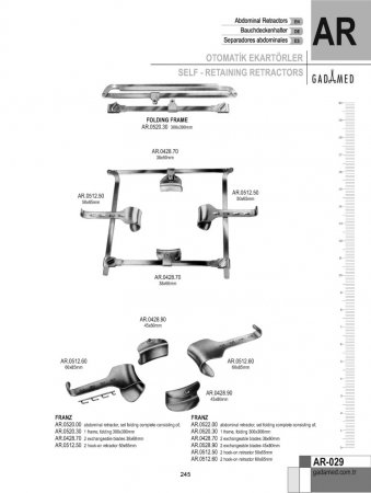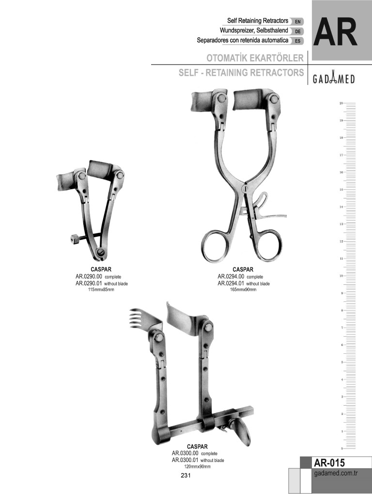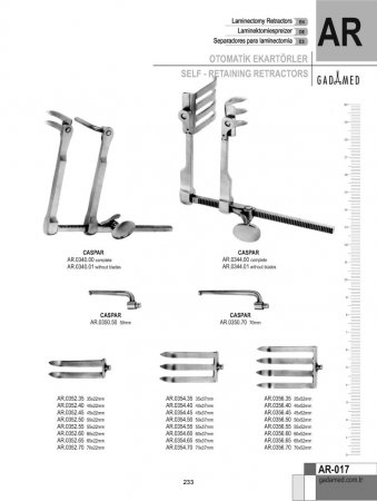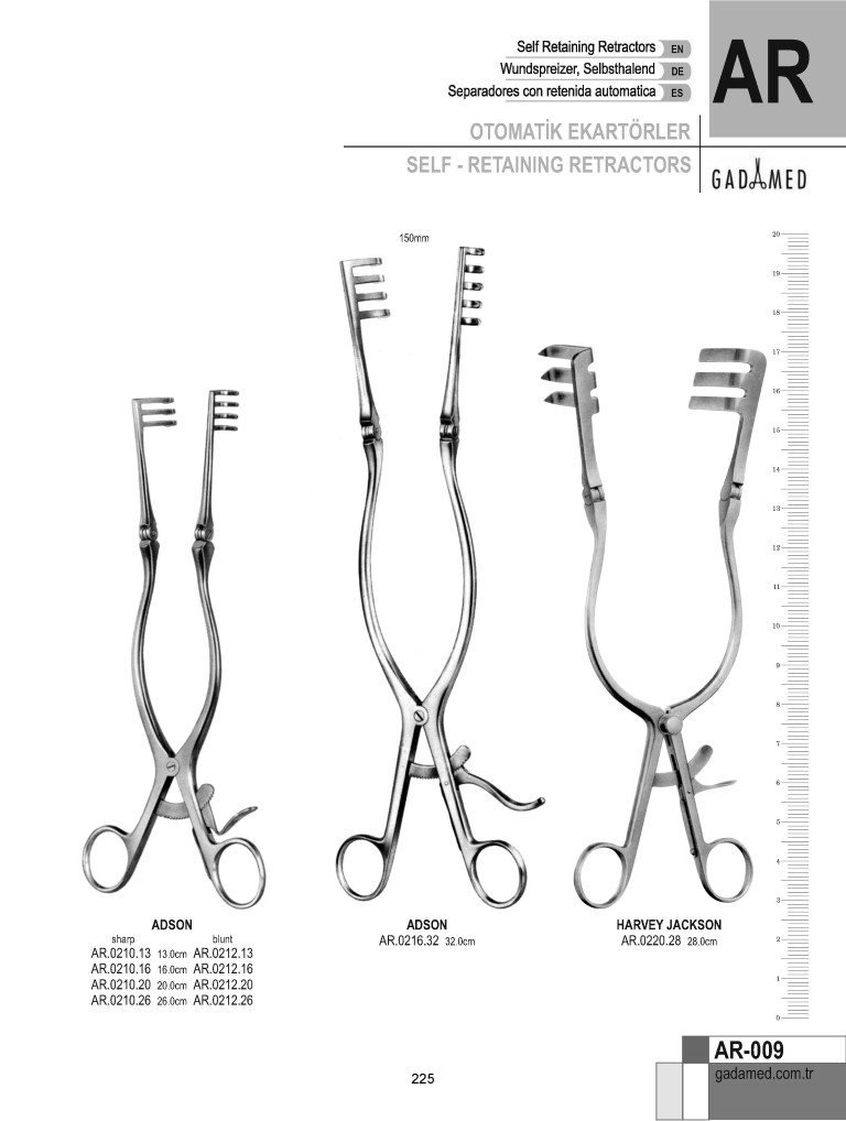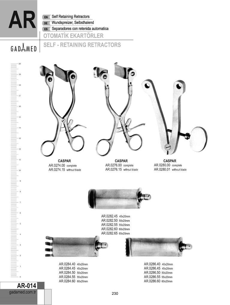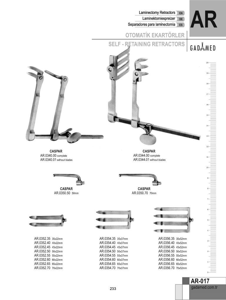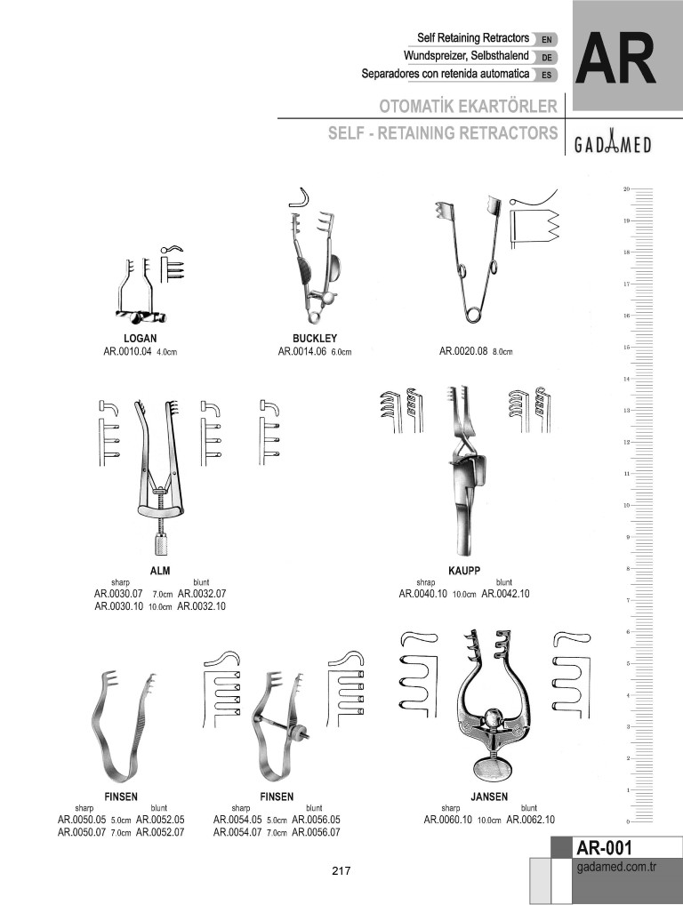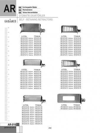 AR.0010.04 8681091028627 Otomatik ekartör, Logan model 3X3T, 4CM AR.0014.06 8681091028634 Otomatik ekartör, Buckley model cilt için keskin 3X3PR. 6CM AR.0020.08 8681091028641 Otomatik ekartör, cilt için 8.0 cm AR.0030.07 8681091028658 Otomatik ekartör, Alm model keskin 7CM AR.0030.10 8681091028665 Otomatik ekartör, Alm model keskin 10CM AR.0032.07 8681091028672 Otomatik ekartör, Alm model künt 7CM AR.0032.10 8681091028689 Otomatik ekartör, Alm model künt 10CM AR.0040.10 8681090891703 Otomatik ekartör, Kaupp model keskin 10.0 cm AR.0042.10 8681091028696 Otomatik ekartör, Kaupp model künt 10.0 cm AR.0050.05 8681091028702 Otomatik ekartör, Finsen model Keskin 3X3PR. 5CM AR.0050.07 8681091028719 Otomatik ekartör, Finsen model Keskin 7CM AR.0052.05 8681091028726 Otomatik ekartör, Finsen model künt 3X3PR. 5CM AR.0052.07 8681091028733 Otomatik ekartör, Finsen model künt 3X3PR. 7CM AR.0054.05 8681091028740 Otomatik ekartör, Finsen model Keskin W/SCREW 5CM AR.0054.07 8681091028757 Otomatik ekartör, Finsen model Keskin 7CM AR.0056.05 8681091028764 Otomatik ekartör, Finsen model künt W/SCREW 5CM AR.0056.07 8681091028771 Otomatik ekartör, Finsen model künt 7CM AR.0060.10 8681091028788 Otomatik ekartör,Jansen model keskin 3X3PR. 10CM AR.0062.10 8681091028795 Otomatik ekartör,Jansen model künt 3X3PR. 10CM AR.0070.00 8681091028801 Otomatik ekartör,Vickers model RİNG MODEL 5CM AR.0072.00 8681091028818 Otomatik ekartör, Vickers model komple AR.0072.01 8681091028825 Otomatik ekartör, Vickers model 12X10MM AR.0072.02 8681091028832 Otomatik ekartör, Vickers model 10X18MM AR.0074.00 8681091028849 Otomatik ekartör, Vickers model 10X12mm AR.0076.00 8681091028856 Otomatik ekartör, Vickers model UNİVERSAL HAND & CARPAL AR.0080.10 8681091028863 Otomatik ekartör, Weitlaner model keskin 2X3PR. 11.5CM AR.0082.10 8681091028870 Otomatik ekartör, Weitlaner model künt 2X3PR. 11.5CM AR.0084.13 8681091028887 Otomatik ekartör, Weitlaner model 3X4PR. SHARP 13CM AR.0084.14 8681091028894 Otomatik ekartör, Weitlaner model 3X4PR. SHARP 14CM AR.0084.16 8681091028900 Otomatik ekartör, Weitlaner model 3X4PR. SHARP 16.5CM AR.0086.13 8681091028917 Otomatik ekartör, Weitlaner model 3X4PR. BLUNT 13CM AR.0086.14 8681091028924 Otomatik ekartör, Weitlaner model 3X4PR. BLUNT 14CM AR.0086.16 8681091028931 Otomatik ekartör, Weitlaner model 3X4PR. BLUNT 16.5CM AR.0088.13 8681091028948 Otomatik ekartör, Weitlaner Wullstein model 3X4PR. SH. 13CM AR.0089.13 8681091028955 Otomatik ekartör, Weitlaner Wullstein model 3X4PR. BL. 13CM AR.0090.13 8681091028962 Otomatik ekartör, Weitlaner Wullstein model 3X3PR. SH. 13CM AR.0092.13 8681091028979 Otomatik ekartör, Weitlaner Wullstein model 3X3PR. BL. 13CM AR.0094.20 8681091028986 Otomatik ekartör, Weitlaner model 3X4PR. keskin 20CM AR.0094.23 8681091028993 Otomatik ekartör, Weitlaner model 3X4PR. keskin 23CM AR.0094.26 8681091029006 Otomatik ekartör, Weitlaner model 3X4PR. keskin 26CM AR.0096.20 8681091029013 Otomatik ekartör, Weitlaner model 3X4PR. keskin 20CM AR.0096.23 8681091029020 Otomatik ekartör, Weitlaner model 3X4PR. keskin 23CM AR.0096.26 8681091029037 Otomatik ekartör, Weitlaner model 3X4PR. keskin 26CM AR.0100.20 8681091029044 Otomatik ekartör, Travers model 4X5PR. 19X25 & 25X25MM, BL. 20CM AR.0100.21 8681091029051 Otomatik ekartör, Travers model 4X5PR. 19X25 & 25X25MM BL 21.5CM AR.0104.13 8681091029068 Otomatik ekartör, Weitlaner baby model SOLİD BLADE 13CM AR.0110.13 8681091029075 Otomatik ekartör, Milligan model 3X3PR. BLUNT 13CM AR.0114.13 8681091029082 Otomatik ekartör, west model keskin 13CM AR.0116.13 8681091029099 Otomatik ekartör, west model künt 13CM AR.0120.19 8681091029105 Otomatik ekartör, Anderson-adson model keskin 4X4PR. 19.5CM AR.0124.13 8681091029112 Otomatik ekartör, Plester model 2X2PR. SHARP 13CM AR.0126.13 8681091029129 Otomatik ekartör, Plester model 2X2PR. BLUNT 13CM AR.0130.11 8681091029136 Otomatik ekartör, Plester model 1X2PR. LEFT 11CM AR.0132.11 8681091029143 Otomatik ekartör, Plester model 1X2PR. RİGHT 11CM AR.0140.14 8681091029150 Otomatik ekartör, Scalp Contour model 3X4PR. keskin 14CM AR.0142.14 8681091029167 Otomatik ekartör, Scalp Contour model 3X4PR. künt 14CM AR.0150.16 8681091029174 Otomatik ekartör, Mollison model 4X4PR. SH 16.5CM AR.0152.15 8681091029181 Otomatik ekartör, Mollison model keskin 15CM AR.0156.18 8681091029198 Otomatik ekartör, Rigby model, Vajinal tip 18.0 cm AR.0160.17 8681091029204 Otomatik ekartör, Mayo-Adams model 17.0 cm AR.0162.17 8681091029211 Otomatik ekartör, Mayo-Adams model Central Bleyt 17CM AR.0170.18 8681091029228 Otomatik ekartör, Darling model CVD 57X38MM 18CM AR.0172.18 8681091029235 Otomatik ekartör, Darling modelCVD 57X38MM 18CM AR.0176.01 8681091029242 Otomatik ekartör, Henley model 3X4PR. SHARP 16.5CM AR.0176.02 8681091029259 Otomatik ekartör, Henley model 3X4PR. BLUNT 16.5CM AR.0176.19 8681091029266 Otomatik ekartör, Henley model bleyt 16X19MM AR.0176.25 8681091029273 Otomatik ekartör, Henley model bleyt16X25MM AR.0176.32 8681091029280 Otomatik ekartör, Henley model bleyt 16X32MM AR.0180.13 8681091029297 Otomatik ekartör, Gelpi-Loktite model 13CM AR.0182.09 8681091029303 Otomatik ekartör, Gelpi model 9CM AR.0182.14 8681091029310 Otomatik ekartör, Gelpi model 14CM AR.0182.16 8681091029327 Otomatik ekartör, Gelpi model 16CM AR.0182.18 8681091029334 Otomatik ekartör, Gelpi model 18CM AR.0186.18 8681091029341 Otomatik ekartör, Gelpi model stoplu 18CM AR.0190.15 8681091029358 Otomatik ekartör, Gelpi Seiletz model 15CM AR.0194.18 8681091029365 Otomatik ekartör, Gelpi Loktite model18CM AR.0196.18 8681091029372 Otomatik ekartör, Gelpi Loktite model 18CM AR.0200.22 8681091029389 Otomatik ekartör, Norfolk-Norwich model 4X5PR. BLUNT 51X215MM AR.0204.01 8681091029396 Otomatik ekartör, 6X6PR. SH, 27CM AR.0204.02 8681091029402 Otomatik ekartör, 6X6PR. SH, 27CM AR.0210.13 8681091029419 Otomatik ekartör, Adson model 3X4PR. keskin, 13CM 
