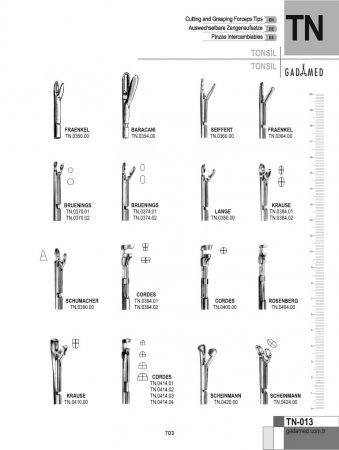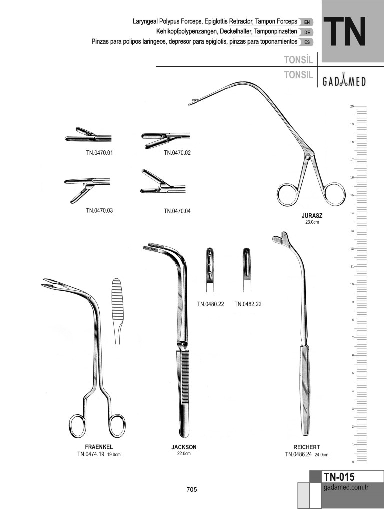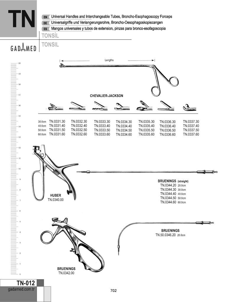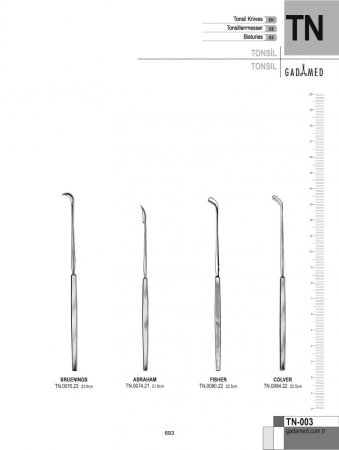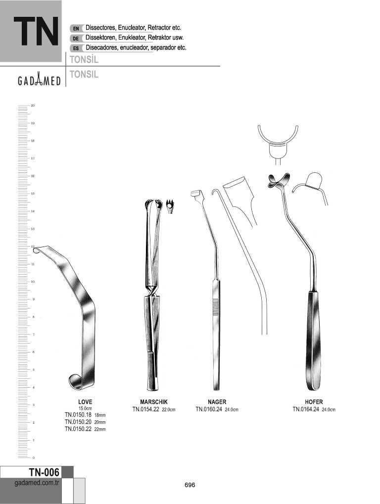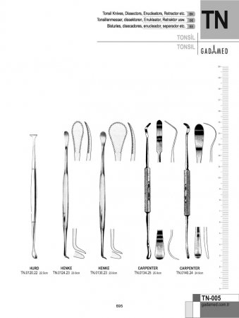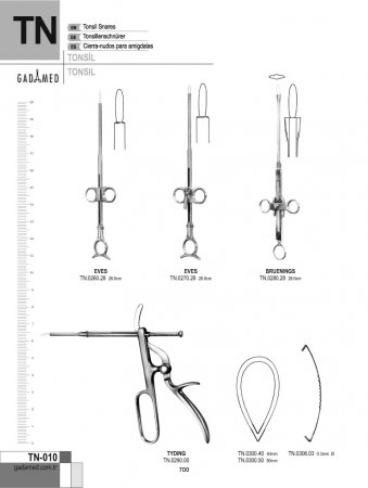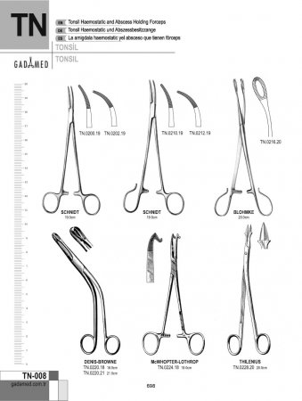 TN.0010.21 8681091076987 HURD YARIK PALATI İĞNESİ SOL 21CM TN.0012.21 8681091076994 HURD YARIK PALATI İĞNESİ SAĞ 21CM TN.0020.25 8681091077007 DURHAM TONSİL İĞNESİ SOL 25CM TN.0022.25 8681091077014 DURHAM TONSİL İĞNESİ SAĞ 25CM TN.0030.26 8681091077021 ROTTER YARIK PALATI İĞNESİ SOL 26CM TN.0032.26 8681091077038 ROTTER YARIK PALATI İĞNESİ SAĞ 26CM TN.0040.24 8681091077045 NAGER TONSİL İĞNESİ 24CM TN.0046.23 8681091077052 CLAUS-EICKEN TONSİL İĞNESİ 23CM TN.0050.22 8681091077069 DUPUY WEİSS TONSİL İĞNESİ SAĞ 22CM TN.0052.22 8681091077076 DUPUY WEİSS TONSİL İĞNESİ SOL 22CM TN.0060.24 8681091077083 FALK TONSİL İĞNESİ SOL 24CM TN.0062.24 8681091077090 FALK TONSİL İĞNESİ SAĞ 24CM TN.0070.23 8681091077106 BREUNİNGS TONSİL BIÇAĞI 23CM TN.0074.21 8681091077113 ABRAHAM TONSİL BIÇAĞI 21CM TN.0080.22 8681091077120 FISHER TONSİL BIÇAĞI 22.5CM TN.0084.22 8681091077137 COLVER TONSİL BIÇAĞI 22.5CM TN.0090.21 8681091077144 DOUGLAS TONSİL BIÇAĞI 21CM TN.0094.21 8681091077151 CANFIELD TONSİL BIÇAĞI 21CM TN.0100.21 8681091077168 TYDING TONSİL BIÇAĞI 21CM TN.0104.20 8681091077175 LYNCH TONSİL BIÇAĞI ve ENÜKLEATÖR ÇİFT 20CM TN.0110.21 8681091077182 DAY TONSİL BIÇAĞI 21.5CM TN.0114.19 8681091077199 LUNIATSCHEK TONSİL GAZLI BEZ PAKETLEYİCİ SH D/E 19CM TN.0120.22 8681091077205 HURD TONSİL DİSSEKTÖRÜ ve PİLLER EKARTÖR 22CM TN.0124.23 8681091077212 HENKE TONSİL DİSSEKTÖRÜ D/E 12MM, 23CM TN.0130.23 8681091077229 HENKE TONSİL DİSSEKTÖRÜ D/E 17MM, 23CM TN.0134.25 8681091077236 CARPENTER TONSİL BIÇAĞI + ENÜKLEATÖR 25CM TN.0140.24 8681091077243 CARPENTER TONSİL BIÇAĞI + ENÜKLEATÖR 24CM TN.0150.18 8681091077250 LOVE TONSİLEKTOMİ EKARTÖRÜ 18MM, 15CM TN.0150.20 8681091077267 LOVE TONSİLEKTOMİ EKARTÖRÜ 20MM, 15CM TN.0150.22 8681091077274 LOVE TONSİLEKTOMİ EKARTÖRÜ 22MM, 15CM TN.0154.22 8681091077281 MARSCHIK TONSİL TUTMA FORSEPSİ 22CM TN.0160.24 8681091077298 NAGER SÜTUN/YUMUŞAK PALAT RET. 13.5MM, 24CM TN.0164.24 8681091077304 HOFER TONSİLEKTOMİ EKARTÖRÜ 24CM TN.0170.21 8681091077311 TIVNEN-TYDİNG TONSİL KAVRAMA FORSEPSİ 2X2T, 21CM TN.0172.21 8681091077328 TIVNEN-TYDİNG TONSİL KAVRAMA FORSEPSİ 3X3T, 21CM TN.0180.20 8681091077335 MUSEUX TONSİL KAVRAMA FORSEPSİ 20CM TN.0181.20 8681091077342 MUSEUX TONSİL KAVRAMA FORSEPSİ YANA KAVİSLİ 20CM TN.0184.21 8681091077359 BALLENGER TONSİL KAVRAMA FORSEPSİ 21.5CM TN.0190.18 8681091077366 WHITE TONSİL KAVRAMA FORSEPSİ 18CM TN.0190.23 8681091077373 WHITE TONSİL KAVRAMA FORSEPSİ 23CM TN.0194.19 8681091077380 COLVER TONSİL KAVRAMA FORSEPSİ 19CM TN.0195.19 8681091077397 COLVER TONSİL KAVRAMA FORSEPSİ 19CM TN.0200.19 8681091077403 SCHNIDT TONSİL FORSEPSİ KAPALI HALKA HAFİF KAVİSLİ 19CM TN.0202.19 8681091077410 SCHNIDT TONSİL FORSEPSİ İLERİ KAVİSLİ KAPALI HALKA 19CM TN.0210.19 8681091077427 SCHNIDT TONSİL FORSEPSİ BİR AÇIK HALKA 19CM TN.0212.19 8681091077434 SCHNIDT TONSİL FORSEPSİ BİR AÇIK HALKA 19CM TN.0216.20 8681091077441 BLOHMKE TONSİL KAVRAMA FORSEPSİ 20CM TN.0220.18 8681091077458 DENIS BROWNE TONSİL TUTMA FORSEPSİ KÜÇÜK 18CM TN.0220.21 8681091077465 DENIS BROWNE TONSİL TUTMA FORSEPSİ BÜYÜK 21CM TN.0224.18 8681091077472 MCWHOPTER LOTHROP TONSİL H/STATİK FORSEPS 18CM TN.0228.20 8681091077489 THILENIUS TONSİL APSE FORSEPSİ 20CM TN.0230.19 8681091077496 NEGUS TONSİL FORSEPSİ ŞEK.1, 19CM TN.0232.19 8681091077502 NEGUS TONSİL FORSEPSİ KAVİSLİ ŞEK.2, 19CM TN.0240.19 8681091077519 BIRKETT TONSİL ARTER FORSEPSİ DÜZ 19CM TN.0241.19 8681091077526 BIRKETT TONSİL ARTER FORSEPSİ KAVİSLİ 19CM TN.0243.19 8681091077533 BIRKETT TONSİL ARTER FORSEPSİ YANA KAVİSLİ 19CM TN.0250.19 8681091077540 WILSON TONSİL A/FORSEPSİ KAVİSLİ ve AÇILI ŞAFT 19CM TN.0254.18 8681091077557 MOLLISON TONSİL ARTER FORSEPSİ AÇILI H/Z 18CM TN.0256.18 8681091077564 MOLLISON TONSİL ARTER FORSEPSİ DİKEY 18CM TN.0260.28 8681091077571 EVES TONSİL KAPANI 28CM TN.0270.28 8681091077588 EVES TONSİL KAPANI MANDALLI 28CM TN.0280.28 8681091077595 BRUENINGS TONSİL KAPANI 28CM TN.0290.00 8681091077601 TYDING TONSİL KAPANI, 1 DÜZ UÇLU TN.0300.40 8681091077618 TONSİL LUPU 40MM (PKT/100) TN.0300.50 8681091077625 TONSİL LUPU 50MM (PKT/100) TN.0306.03 8681091077632 TONSİL LUPU 0.3MM (HER BİRİNDE 12) TN.0310.13 8681091077649 HARTMANN TONSİL PANÇ FORSEPSİ Í 13MM, 12CM TN.0310.15 8681091077656 HARTMANN TONSİL PANÇ FORSEPSİ Í 15MM, 12CM TN.0310.17 8681091077663 HARTMANN TONSİL PANÇ FORSEPSİ Í 17MM, 12CM TN.0320.00 8681091077670 SLUDER-BALLENGER TONSİLOTOM, 3 BIÇAKLI TN.0320.01 8681091077687 SLUDER-BALLENGER TONSİLOTOM İÇİN BIÇAK ŞEK.1 TN.0320.02 8681091077694 SLUDER-BALLENGER TONSİLOTOM İÇİN BIÇAK ŞEK.2 TN.0320.03 8681091077700 SLUDER-BALLENGER TONSİLOTOM İÇİN BIÇAK ŞEK.3 TN.0331.30 8681091077717 CHEVALIER JACKSON FORSEPSİ ŞEK.1, 30CM TN.0331.40 8681091077724 CHEVALIER JACKSON FORSEPSİ ŞEK.1, 40CM TN.0331.50 8681091077731 CHEVALIER JACKSON FORSEPSİ ŞEK.1, 50CM TN.0331.60 8681091077748 CHEVALIER JACKSON FORSEPSİ ŞEK.1, 60CM TN.0332.30 8681091077755 CHEVALIER JACKSON FORSEPSİ ŞEK.2, 30CM TN.0332.40 8681091077762 CHEVALIER JACKSON FORSEPSİ ŞEK.2, 40CM TN.0332.50 8681091077779 CHEVALIER JACKSON FORSEPSİ ŞEK.2, 50CM TN.0332.60 8681091077786 CHEVALIER JACKSON FORSEPSİ ŞEK.2, 60CM TN.0333.30 8681091077793 CHEVALIER JACKSON FORSEPSİ ŞEK.3, 30CM TN.0333.40 8681091077809 CHEVALIER JACKSON FORSEPSİ ŞEK.3, 40CM TN.0333.50 8681091077816 CHEVALIER JACKSON FORSEPSİ ŞEK.3, 50CM TN.0333.60 8681091077823 CHEVALIER JACKSON FORSEPSİ ŞEK.3, 60CM TN.0334.30 8681091077830 CHEVALIER JACKSON FORSEPSİ ŞEK.4, 30CM TN.0334.40 8681091077847 CHEVALIER JACKSON FORSEPSİ ŞEK.4, 40CM TN.0334.50 8681091077854 CHEVALIER JACKSON FORSEPSİ ŞEK.4, 50CM TN.0334.60 8681091077861 CHEVALIER JACKSON FORSEPSİ ŞEK.4, 60CM TN.0335.30 8681091077878 CHEVALIER JACKSON FORSEPSİ ŞEK.5, 30CM TN.0335.40 8681091077885 