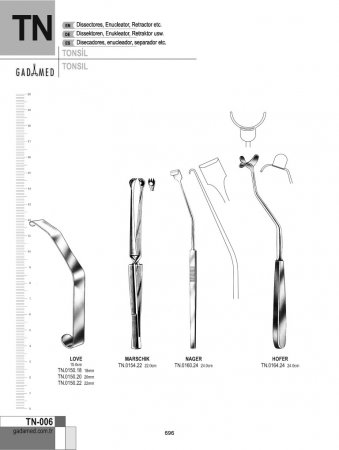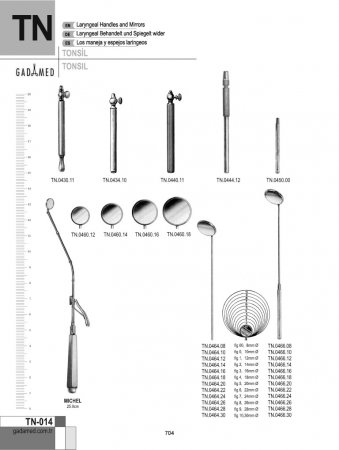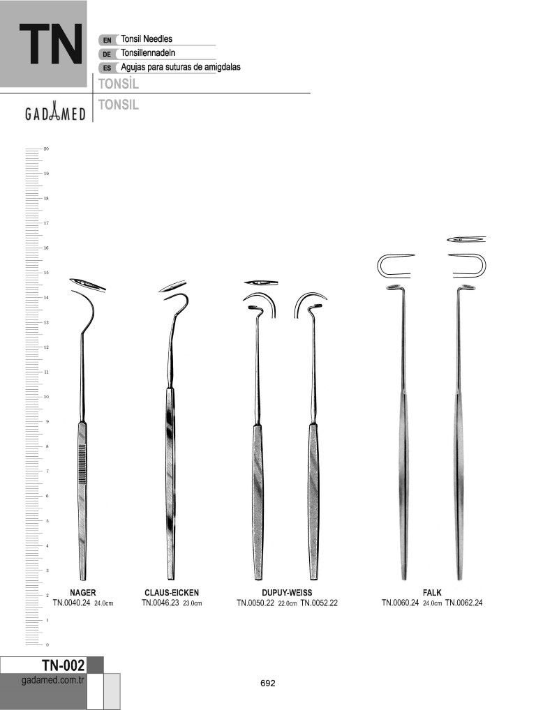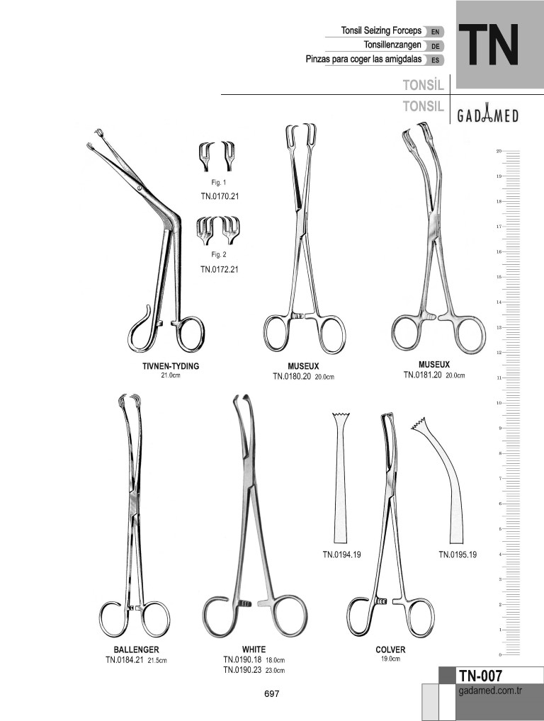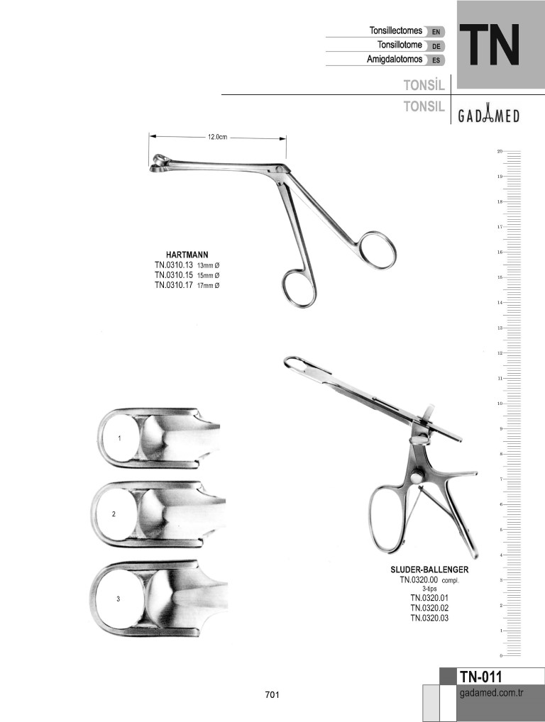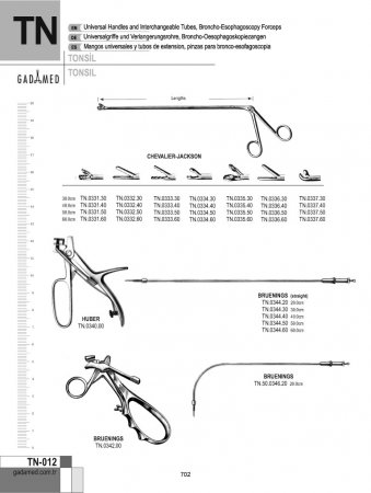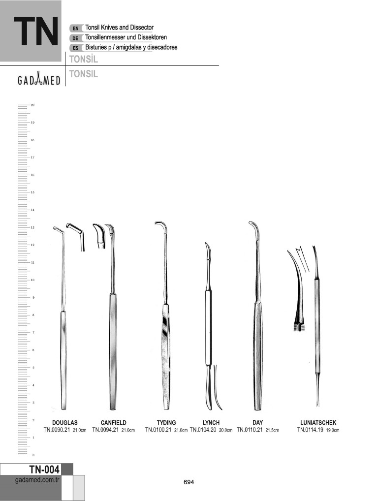 TN.0010.21 8681091076987 HURD YARIK PALATI İĞNESİ SOL 21CM TN.0012.21 8681091076994 HURD YARIK PALATI İĞNESİ SAĞ 21CM TN.0020.25 8681091077007 DURHAM TONSİL İĞNESİ SOL 25CM TN.0022.25 8681091077014 DURHAM TONSİL İĞNESİ SAĞ 25CM TN.0030.26 8681091077021 ROTTER YARIK PALATI İĞNESİ SOL 26CM TN.0032.26 8681091077038 ROTTER YARIK PALATI İĞNESİ SAĞ 26CM TN.0040.24 8681091077045 NAGER TONSİL İĞNESİ 24CM TN.0046.23 8681091077052 CLAUS-EICKEN TONSİL İĞNESİ 23CM TN.0050.22 8681091077069 DUPUY WEİSS TONSİL İĞNESİ SAĞ 22CM TN.0052.22 8681091077076 DUPUY WEİSS TONSİL İĞNESİ SOL 22CM TN.0060.24 8681091077083 FALK TONSİL İĞNESİ SOL 24CM TN.0062.24 8681091077090 FALK TONSİL İĞNESİ SAĞ 24CM TN.0070.23 8681091077106 BREUNİNGS TONSİL BIÇAĞI 23CM TN.0074.21 8681091077113 ABRAHAM TONSİL BIÇAĞI 21CM TN.0080.22 8681091077120 FISHER TONSİL BIÇAĞI 22.5CM TN.0084.22 8681091077137 COLVER TONSİL BIÇAĞI 22.5CM TN.0090.21 8681091077144 DOUGLAS TONSİL BIÇAĞI 21CM TN.0094.21 8681091077151 CANFIELD TONSİL BIÇAĞI 21CM TN.0100.21 8681091077168 TYDING TONSİL BIÇAĞI 21CM TN.0104.20 8681091077175 LYNCH TONSİL BIÇAĞI ve ENÜKLEATÖR ÇİFT 20CM TN.0110.21 8681091077182 DAY TONSİL BIÇAĞI 21.5CM TN.0114.19 8681091077199 LUNIATSCHEK TONSİL GAZLI BEZ PAKETLEYİCİ SH D/E 19CM TN.0120.22 8681091077205 HURD TONSİL DİSSEKTÖRÜ ve PİLLER EKARTÖR 22CM TN.0124.23 8681091077212 HENKE TONSİL DİSSEKTÖRÜ D/E 12MM, 23CM TN.0130.23 8681091077229 HENKE TONSİL DİSSEKTÖRÜ D/E 17MM, 23CM TN.0134.25 8681091077236 CARPENTER TONSİL BIÇAĞI + ENÜKLEATÖR 25CM TN.0140.24 8681091077243 CARPENTER TONSİL BIÇAĞI + ENÜKLEATÖR 24CM TN.0150.18 8681091077250 LOVE TONSİLEKTOMİ EKARTÖRÜ 18MM, 15CM TN.0150.20 8681091077267 LOVE TONSİLEKTOMİ EKARTÖRÜ 20MM, 15CM TN.0150.22 8681091077274 LOVE TONSİLEKTOMİ EKARTÖRÜ 22MM, 15CM TN.0154.22 8681091077281 MARSCHIK TONSİL TUTMA FORSEPSİ 22CM TN.0160.24 8681091077298 NAGER SÜTUN/YUMUŞAK PALAT RET. 13.5MM, 24CM TN.0164.24 8681091077304 HOFER TONSİLEKTOMİ EKARTÖRÜ 24CM TN.0170.21 8681091077311 TIVNEN-TYDİNG TONSİL KAVRAMA FORSEPSİ 2X2T, 21CM TN.0172.21 8681091077328 TIVNEN-TYDİNG TONSİL KAVRAMA FORSEPSİ 3X3T, 21CM TN.0180.20 8681091077335 MUSEUX TONSİL KAVRAMA FORSEPSİ 20CM TN.0181.20 8681091077342 MUSEUX TONSİL KAVRAMA FORSEPSİ YANA KAVİSLİ 20CM TN.0184.21 8681091077359 BALLENGER TONSİL KAVRAMA FORSEPSİ 21.5CM TN.0190.18 8681091077366 WHITE TONSİL KAVRAMA FORSEPSİ 18CM TN.0190.23 8681091077373 WHITE TONSİL KAVRAMA FORSEPSİ 23CM TN.0194.19 8681091077380 COLVER TONSİL KAVRAMA FORSEPSİ 19CM TN.0195.19 8681091077397 COLVER TONSİL KAVRAMA FORSEPSİ 19CM TN.0200.19 8681091077403 SCHNIDT TONSİL FORSEPSİ KAPALI HALKA HAFİF KAVİSLİ 19CM TN.0202.19 8681091077410 SCHNIDT TONSİL FORSEPSİ İLERİ KAVİSLİ KAPALI HALKA 19CM TN.0210.19 8681091077427 SCHNIDT TONSİL FORSEPSİ BİR AÇIK HALKA 19CM TN.0212.19 8681091077434 SCHNIDT TONSİL FORSEPSİ BİR AÇIK HALKA 19CM TN.0216.20 8681091077441 BLOHMKE TONSİL KAVRAMA FORSEPSİ 20CM TN.0220.18 8681091077458 DENIS BROWNE TONSİL TUTMA FORSEPSİ KÜÇÜK 18CM TN.0220.21 8681091077465 DENIS BROWNE TONSİL TUTMA FORSEPSİ BÜYÜK 21CM TN.0224.18 8681091077472 MCWHOPTER LOTHROP TONSİL H/STATİK FORSEPS 18CM TN.0228.20 8681091077489 THILENIUS TONSİL APSE FORSEPSİ 20CM TN.0230.19 8681091077496 NEGUS TONSİL FORSEPSİ ŞEK.1, 19CM TN.0232.19 8681091077502 NEGUS TONSİL FORSEPSİ KAVİSLİ ŞEK.2, 19CM TN.0240.19 8681091077519 BIRKETT TONSİL ARTER FORSEPSİ DÜZ 19CM TN.0241.19 8681091077526 BIRKETT TONSİL ARTER FORSEPSİ KAVİSLİ 19CM TN.0243.19 8681091077533 BIRKETT TONSİL ARTER FORSEPSİ YANA KAVİSLİ 19CM TN.0250.19 8681091077540 WILSON TONSİL A/FORSEPSİ KAVİSLİ ve AÇILI ŞAFT 19CM TN.0254.18 8681091077557 MOLLISON TONSİL ARTER FORSEPSİ AÇILI H/Z 18CM TN.0256.18 8681091077564 MOLLISON TONSİL ARTER FORSEPSİ DİKEY 18CM TN.0260.28 8681091077571 EVES TONSİL KAPANI 28CM TN.0270.28 8681091077588 EVES TONSİL KAPANI MANDALLI 28CM TN.0280.28 8681091077595 BRUENINGS TONSİL KAPANI 28CM TN.0290.00 8681091077601 TYDING TONSİL KAPANI, 1 DÜZ UÇLU TN.0300.40 8681091077618 TONSİL LUPU 40MM (PKT/100) TN.0300.50 8681091077625 TONSİL LUPU 50MM (PKT/100) TN.0306.03 8681091077632 TONSİL LUPU 0.3MM (HER BİRİNDE 12) TN.0310.13 8681091077649 HARTMANN TONSİL PANÇ FORSEPSİ Í 13MM, 12CM TN.0310.15 8681091077656 HARTMANN TONSİL PANÇ FORSEPSİ Í 15MM, 12CM TN.0310.17 8681091077663 HARTMANN TONSİL PANÇ FORSEPSİ Í 17MM, 12CM TN.0320.00 8681091077670 SLUDER-BALLENGER TONSİLOTOM, 3 BIÇAKLI TN.0320.01 8681091077687 SLUDER-BALLENGER TONSİLOTOM İÇİN BIÇAK ŞEK.1 TN.0320.02 8681091077694 SLUDER-BALLENGER TONSİLOTOM İÇİN BIÇAK ŞEK.2 TN.0320.03 8681091077700 SLUDER-BALLENGER TONSİLOTOM İÇİN BIÇAK ŞEK.3 TN.0331.30 8681091077717 CHEVALIER JACKSON FORSEPSİ ŞEK.1, 30CM TN.0331.40 8681091077724 CHEVALIER JACKSON FORSEPSİ ŞEK.1, 40CM TN.0331.50 8681091077731 CHEVALIER JACKSON FORSEPSİ ŞEK.1, 50CM TN.0331.60 8681091077748 CHEVALIER JACKSON FORSEPSİ ŞEK.1, 60CM TN.0332.30 8681091077755 CHEVALIER JACKSON FORSEPSİ ŞEK.2, 30CM TN.0332.40 8681091077762 CHEVALIER JACKSON FORSEPSİ ŞEK.2, 40CM TN.0332.50 8681091077779 CHEVALIER JACKSON FORSEPSİ ŞEK.2, 50CM TN.0332.60 8681091077786 CHEVALIER JACKSON FORSEPSİ ŞEK.2, 60CM TN.0333.30 8681091077793 CHEVALIER JACKSON FORSEPSİ ŞEK.3, 30CM TN.0333.40 8681091077809 CHEVALIER JACKSON FORSEPSİ ŞEK.3, 40CM TN.0333.50 8681091077816 CHEVALIER JACKSON FORSEPSİ ŞEK.3, 50CM TN.0333.60 8681091077823 CHEVALIER JACKSON FORSEPSİ ŞEK.3, 60CM TN.0334.30 8681091077830 CHEVALIER JACKSON FORSEPSİ ŞEK.4, 30CM TN.0334.40 8681091077847 CHEVALIER JACKSON FORSEPSİ ŞEK.4, 40CM TN.0334.50 8681091077854 CHEVALIER JACKSON FORSEPSİ ŞEK.4, 50CM TN.0334.60 8681091077861 CHEVALIER JACKSON FORSEPSİ ŞEK.4, 60CM TN.0335.30 8681091077878 CHEVALIER JACKSON FORSEPSİ ŞEK.5, 30CM TN.0335.40 8681091077885 